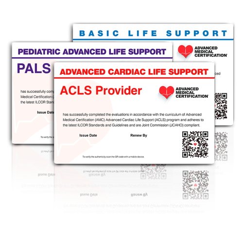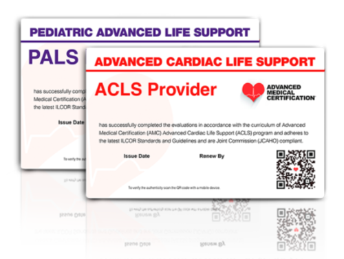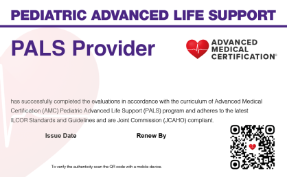 Your PALS provider card displays your name, the Advanced Medical Certification logo, course completion date, expiration date, and validating signature.