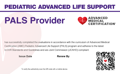 Advanced Medical Certification offers continuing education credits in ACLS, BLS and PALS certification and recertification. Our courses are eligible for AMA Category 1 Credits™. An accredited provider, the Postgraduate Institute for Medicine (PIM), has reviewed AMC’s Pediatric Advanced Life Support (PALS) Certification Course, and the PALS Certification training course has been approved for AMA Category 1 Credits™.