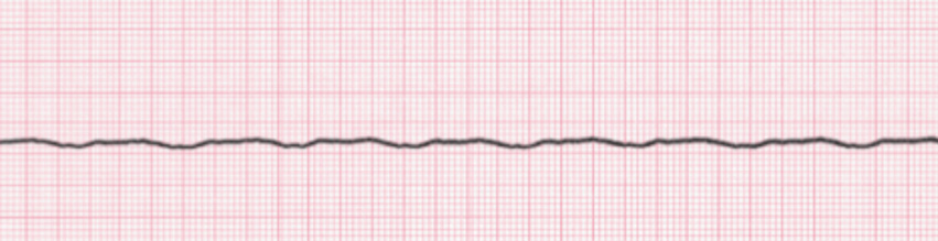 The rhythm strip demonstrates asystole. This is not a shockable rhythm. Initiate CPR and give 1mg epinephrine every 3-5 minutes, re-assessing after each round of CPR.