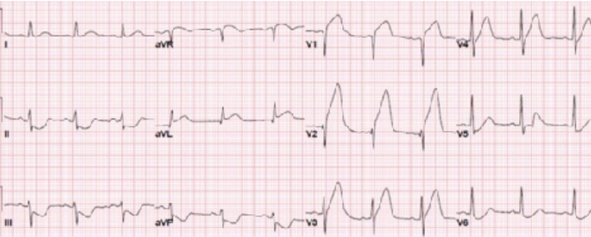 The patient’s EKG demonstrates anterior STEMI with ST elevation in V1 - V4 with reciprocal changes in the inferior leads (II, III, AVF). Aspirin is the therapy that has been proven to improve morbidity and mortality in STEMI patient and should be given as soon as possible. Early intervention via cardiac catheterization is imperative. If emergent catheterization is not available at your facility; lytic therapy should be provided.