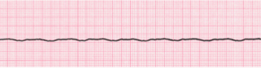 The rhythm strip demonstrates asystole. Like PEA arrest, asystole is not amenable to electricity/defibrillation. As such, continue effective CPR, administer epinephrine every 3-5 minutes and continue to attempt to identify underlying cause.