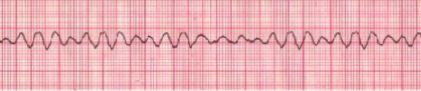 The patient remains unresponsive and pulseless. The initial rhythm on the monitor demonstrates the following: